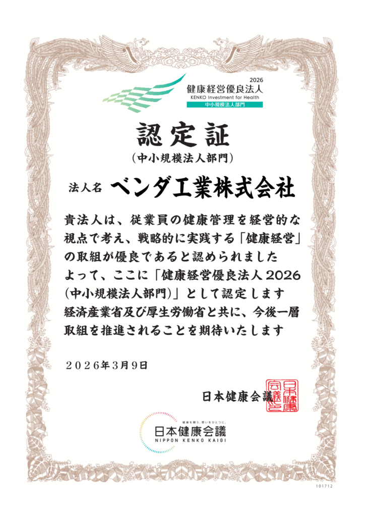 ベンダ工業が7年連続で、健康経営優良法人2025に選定されました。また、健康経営優良法人2025中小規模法人部門19796法人の上位1000法人であるネクストブライト1000として表彰されました。