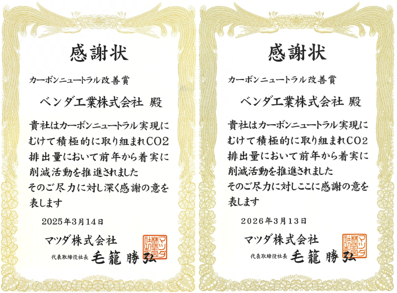 マツダ株式会社様よりカーボンニュートラル実現に向けた取組みに対する感謝状を授与頂きました。感謝状授与は2024年度及び2025年度の2年連続となり、CO2削減の取組みを評価頂いております。