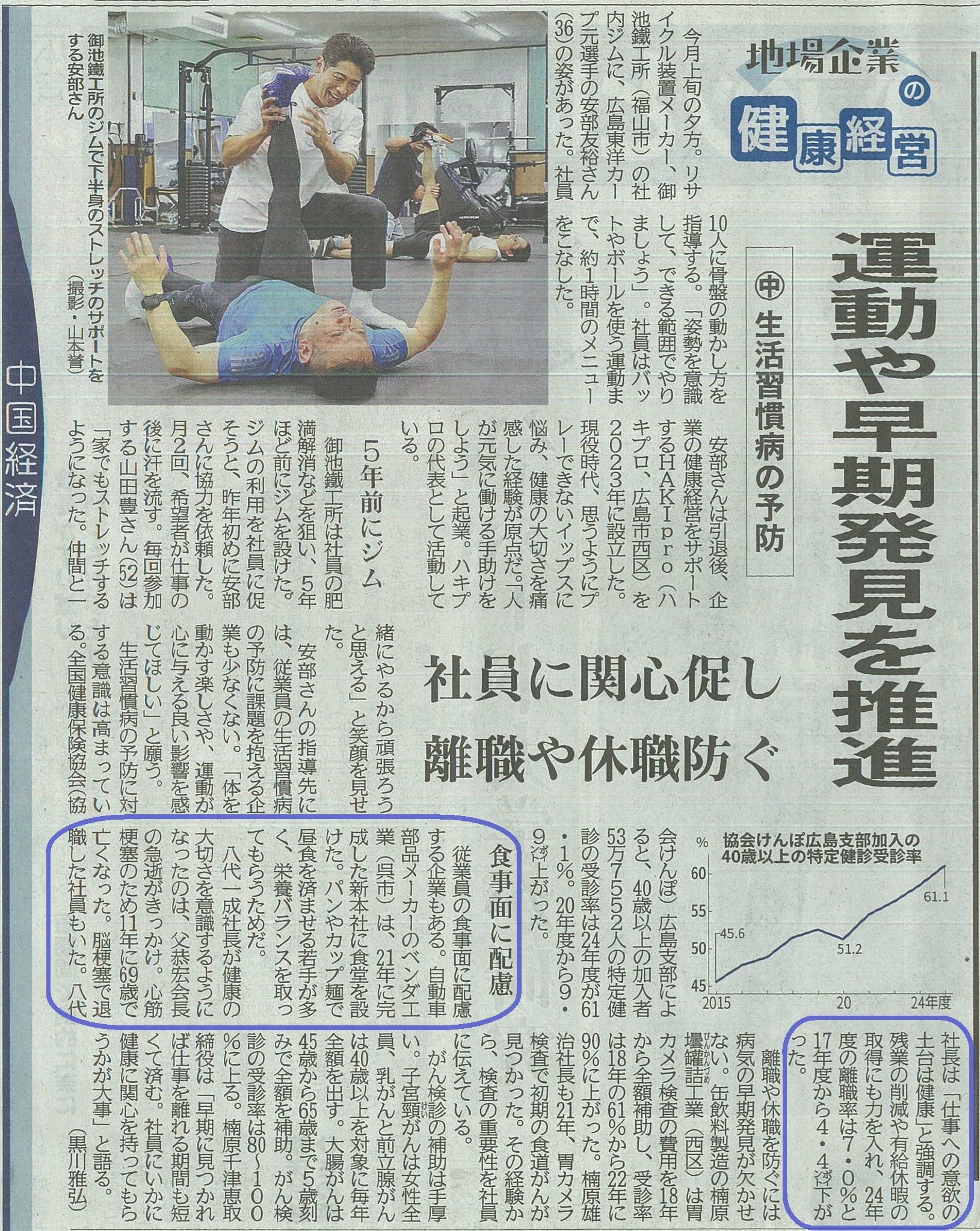 10月22日の中国新聞において、地場企業の健康経営シリーズの中で、従業員の食事面に 配慮している企業として紹介されました。併せて、残業の削減や有給休暇の取得にも力を入れ、 離職率低減効果があったことをお伝えしました。