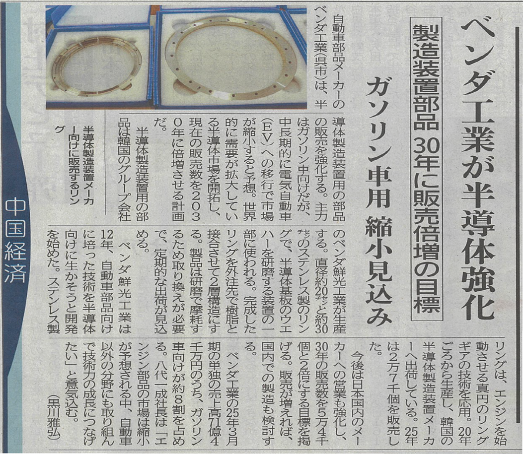中国新聞にてベンダ工業の半導体製造装置向けの部品販売について紹介